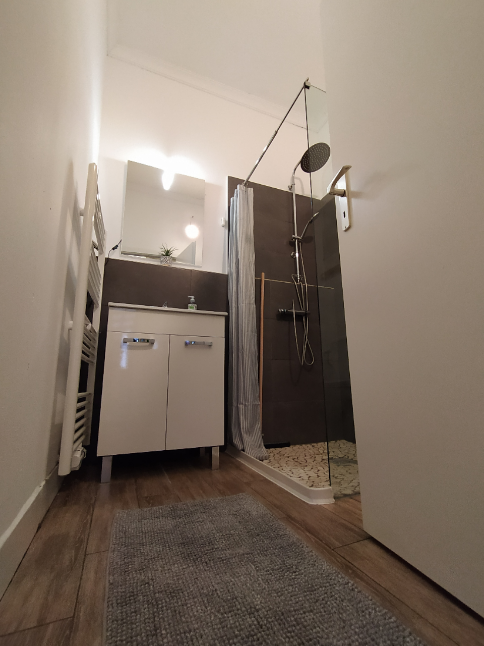 Das kleine Duschbad wurde mit einer großzügigen, ebenerdigen Dusche ausgestattet. Handtücher sind inklusive.